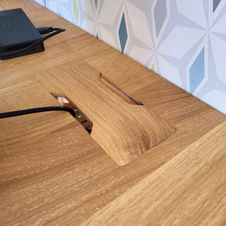 - Plusieurs encoches situées à l’arrière du meuble facilitent la gestion des câbles et permettent de dissimuler la connectique, assurant ainsi un espace de travail net et organisé. Multiprise intégrée au plateau principal.