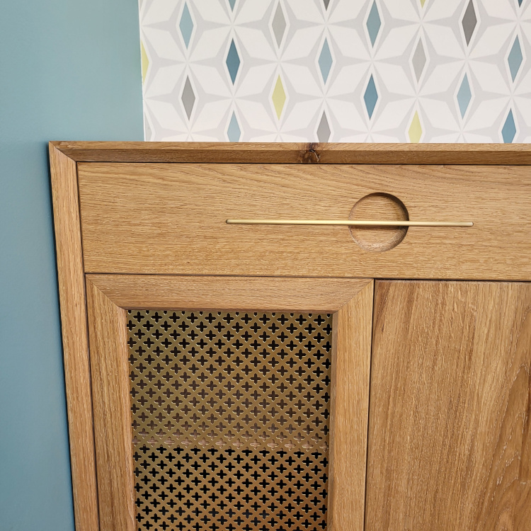 Fabriqué en chêne massif, ce bureau bénéficie d’une robustesse et d’une longévité exceptionnelles. Les poignées en laiton usinées à la main ainsi que les grilles laiton apportent une touche raffinée et délicate à l’ensemble. La finition choisie, à l’huile de lin écologique, permet de garder la teinte naturelle du chêne et de sublimer le grain du bois tout en assurant une protection naturelle et durable.