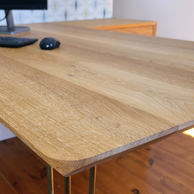 Grand bureau pour deux personnes avec multiples rangements, en chêne massif et laiton. Design minimaliste avec une touche années 50.